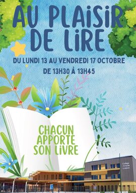 Chaque semaine précédant les vacances scolaire, "un quart d'heure lecture" est proposé à tous les élèves et membres du personnel du collège Jacques Chirac. Avant les vacances d'Automne, ce moment privilégié se déroulera de 13h30 à 13h40.