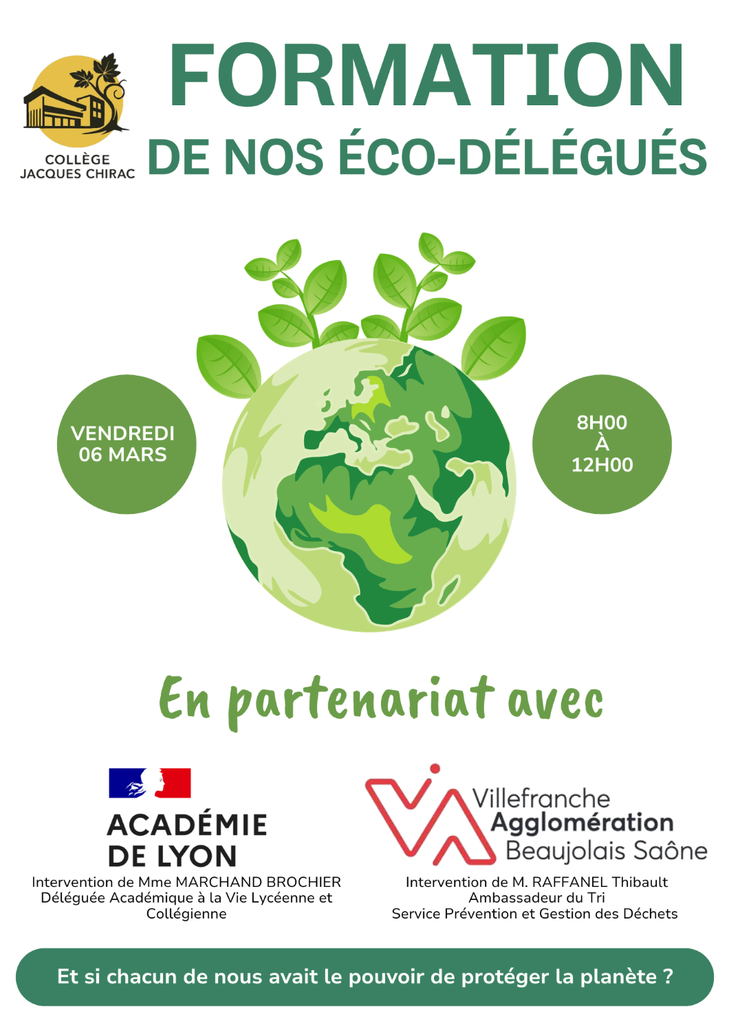 Le 6 mars, les Éco‑Délégués du collège Jacques Chirac ont participé à une matinée de formation en partenariat avec le CAVL de l’agglomération de Villefranche‑sur‑Saône et le rectorat de Lyon. Ce temps d’échanges et d’ateliers leur a permis de renforcer leurs connaissances et de préparer des actions concrètes en faveur du développement durable au sein de l’établissement.