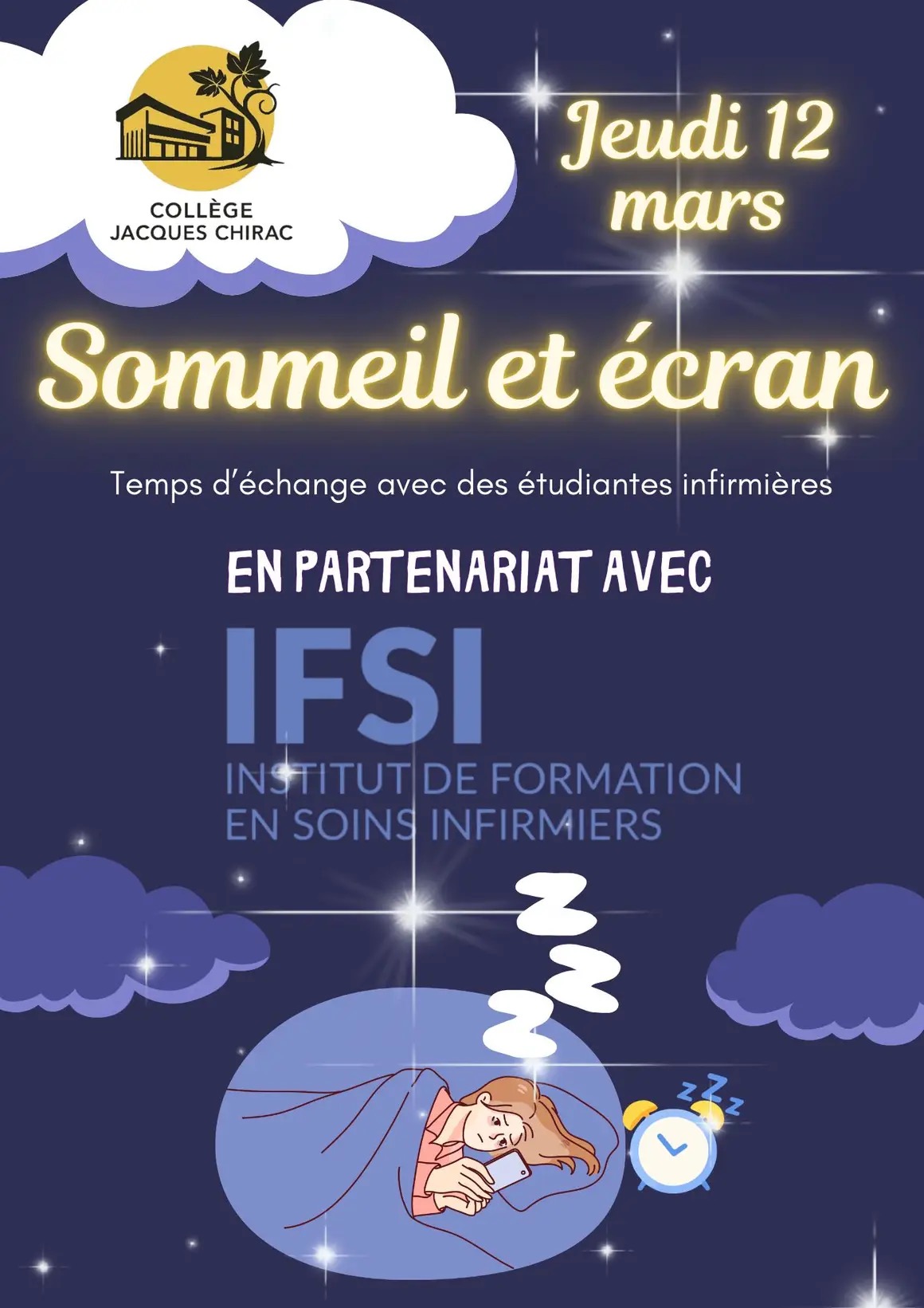 Ce jeudi 12 mars, une intervention des élèves infirmières de l’IFSI de St Genis Laval était proposée à tous les élèves de 6eme sur le thème du sommeil et des écrans